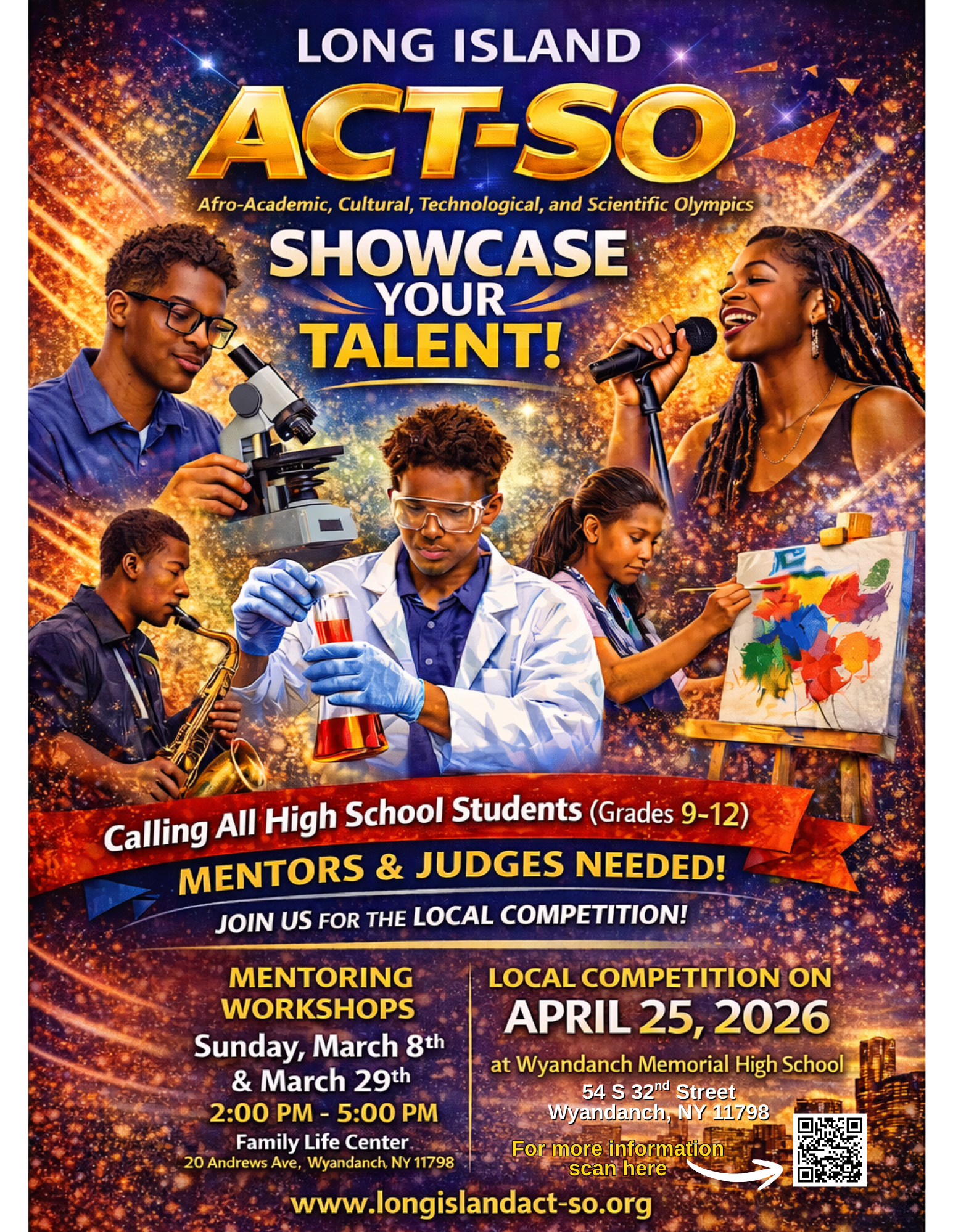ACT-SO is a stimulating year-long achievement program for 9-12th grade students focusing on development through academic and cultural achievement. ACT-SO also hosts a yearly competition comprised of 32 categories including STEM, humanities, performing, visual and culinary arts.
